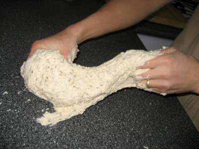Once all in, mix using hands. I think this is the only way to do it, bugger the electric mixer or bread machine mixer. You get a good feel for the dough using your hands an know if you need more flour or water. Different flours absorb water at different rates so get a good feel for the dough and adjust accordingly.